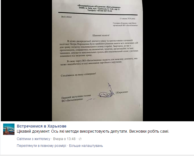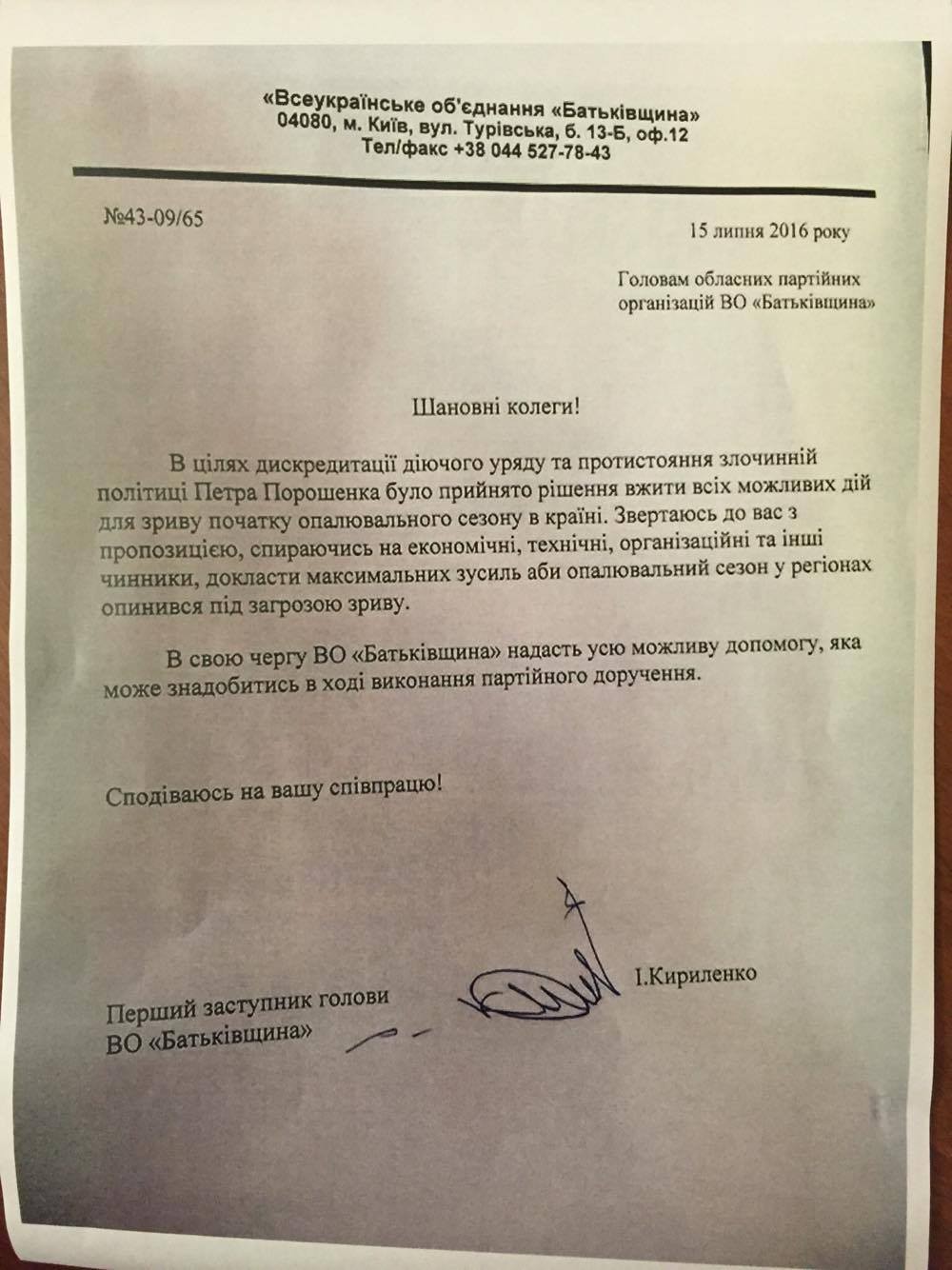 В Мережі показали документ, в якому партія "Батьківщина" дає доручення своїм осередкам в регіонах робити все можливе, щоб зірвати початок опалювального сезону. А все це заради того, щоб "насолити" та дискредитувати Президента Петра Порошенка