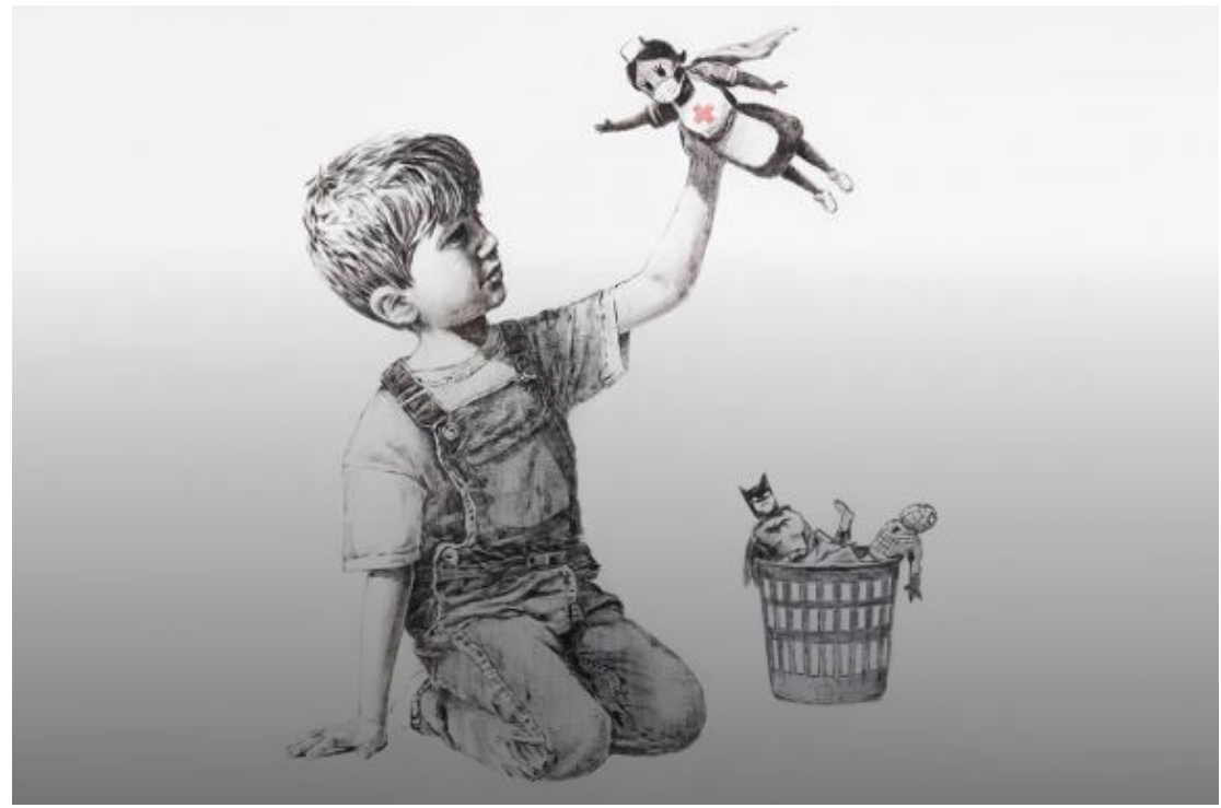 Британський вуличний художник Бенксі опублікував нову картину - на ній дитина грає медсестрою в образі супергероя, тоді як персонажі коміксів Людина-павук та Бетмен відправились у смітник.