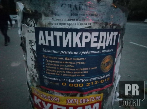 На стовпах у Києві розклеєна ось така партизанська реклама. Розрахунок на тих, хто не хоче виплачувати кредит. Тому й заголовок привабливий: "Антикредит". Насправді, реклама не обіцяє не виплату кредиту, а юристи беруться пляснити як правильно діяти, щоб спокійно спати і не нервувати