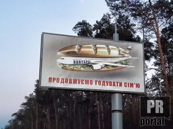 На бориспільській трасі з'явились біллборди на яких літак з назвою "Бориспіль" немов хот-дог поміщенний у золотий батон, який було знайдено в Межигір'ї Віктора Януковича. "Продовжуємо годувати Сім'ю", - написано на рекламі.