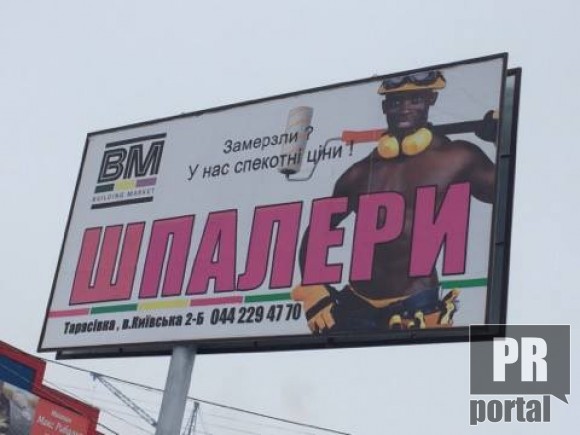 Будівельний супермаркет у Тарасівці, що під Києвом, продовжує експлуатувати працю афроамериканця. Цього разу негр на борді, схоже, пропонує поклеїти шпалери