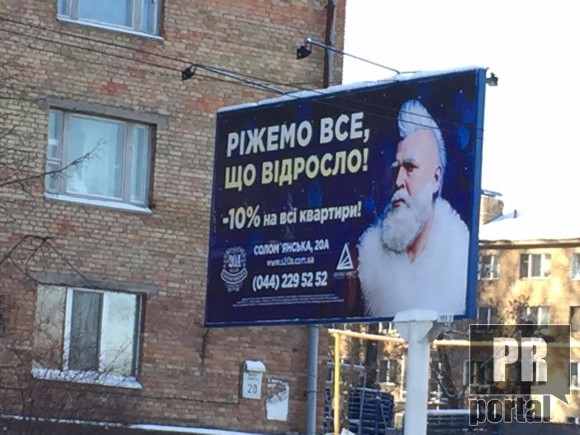 Наприклад, на борді зображено людину більше схожу на Діда Мороза, але з оригінальною зачіскою. Слоган "ріжемо усе, що відросло!" вперто викликає асоціацію з перекурнею.