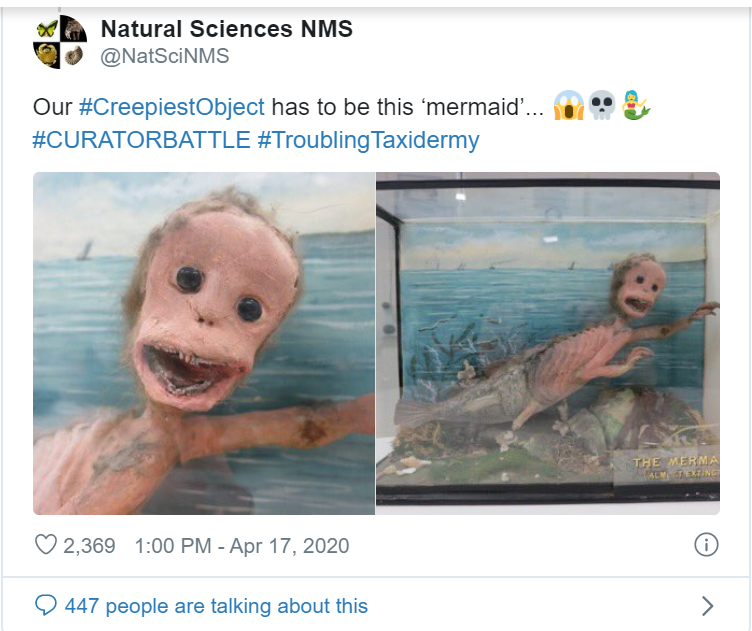 Отдел Естествоведения Национального музея Шотландии представил прекрасный образец таксидермии — гибрид рыбы и обезьяны, так называемой фиджийской морской девы, популярный экспонат бродячих цирков Викторианской эпохи.