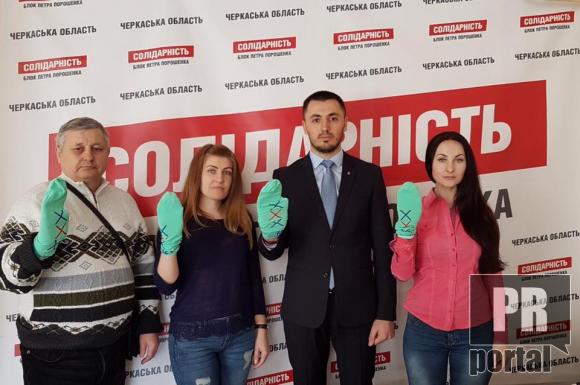 Креативно до флеш-мобу підійшли керівники Черкаської обласної організації БПП "Солідарність". Шкарпетки, точніше одну шкарпетку, вони одягнули на руку.