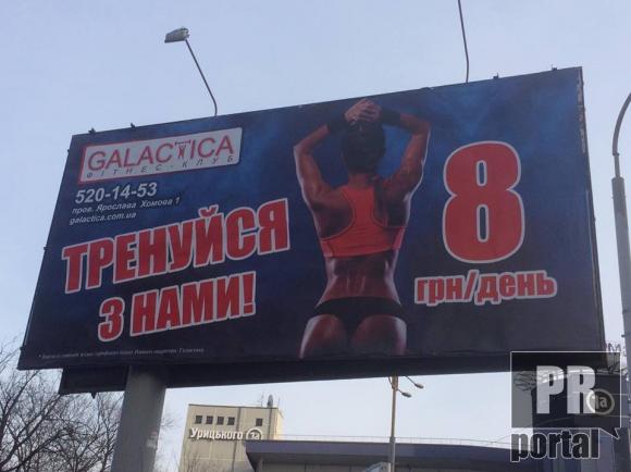 Рекама зроблена грамотно. В очі кидається гарна фігура, приваблива ціна у 8 гривень в день і слоган "Тренуйся з нами"