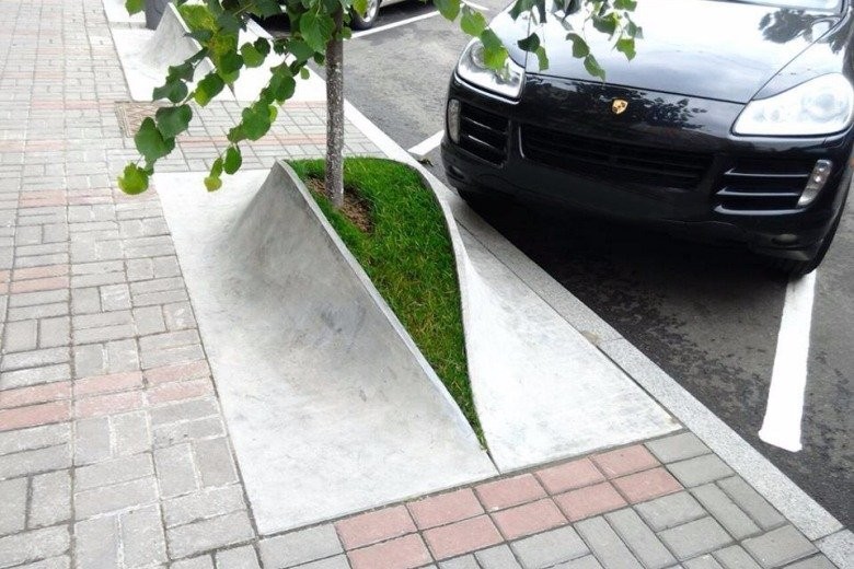 Отметим, такие интересные клумбы появились на бульваре Леси Украинки в Киеве. Форма клумб не позволяет машинам, которые паркуются рядом, повредить саженцы.