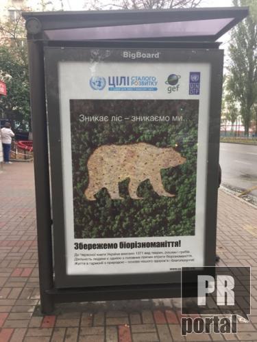 На вулицях країни з'явилася соціальна реклама благодійного фонду та організації ЮНІСЕФ. «Зникає ліс – зникаємо ми», - написано на сіті-лайті, де деревина у горах вирізана у формі ведмедя