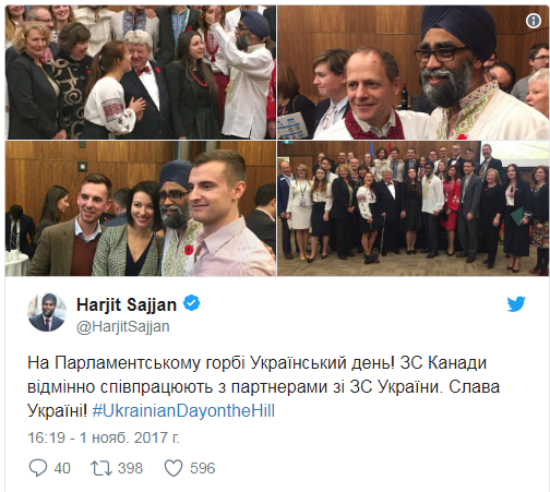 Министр обороны Канады Харджит Сингх Саджан присоединился к "Украинскому дню в парламенте Канады". Он надел вышиванку и разместил в Twitter пост на украинском языке.