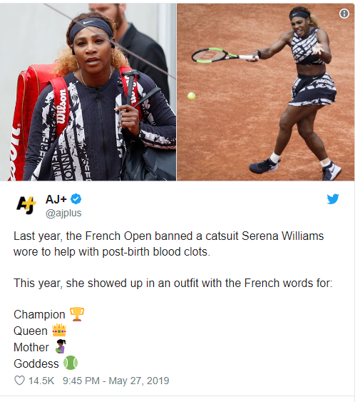 23-кратная победительница турниров Большого шлема в одиночном разряде американка Серена Уильямс вышла на стартовый матч Открытого чемпионата Франции с россиянкой Виталией Дьяченко в куртке, на которой были нанесены слова на французском языке: "Мать, королева, чемпионка, богиня".