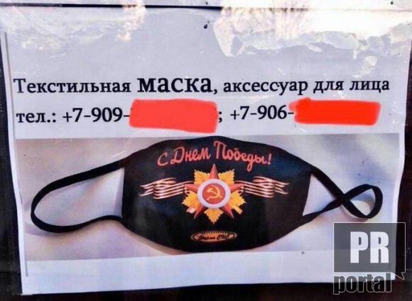 На Росії пропонують захисні маски «З Днем поремоги!». Як інформує PRпортал, очевидно, це міг би бути важливим аксесуаром під час параду на Червоній площі у Москві.