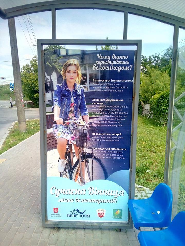Вже тиждень на зупинках громадськго транспорту у вінниці можна побачити соцільну рекламу котра рекламує велопрогулянки.