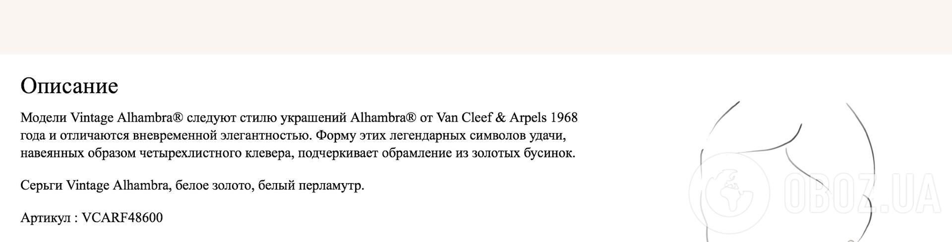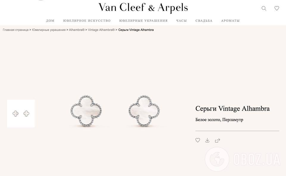 На официальном сайте ювелирного дома отмечается, что модель, замеченная на Южаниной, отличается вневременной элегантностью. "Форму этих легендарных символов удачи, навеянных образом четырехлистного клевера, подчеркивает обрамление из золотых бусинок. Серьги Vintage Alhambra, белое золото, белый перламутр", - говорится в описании модели.