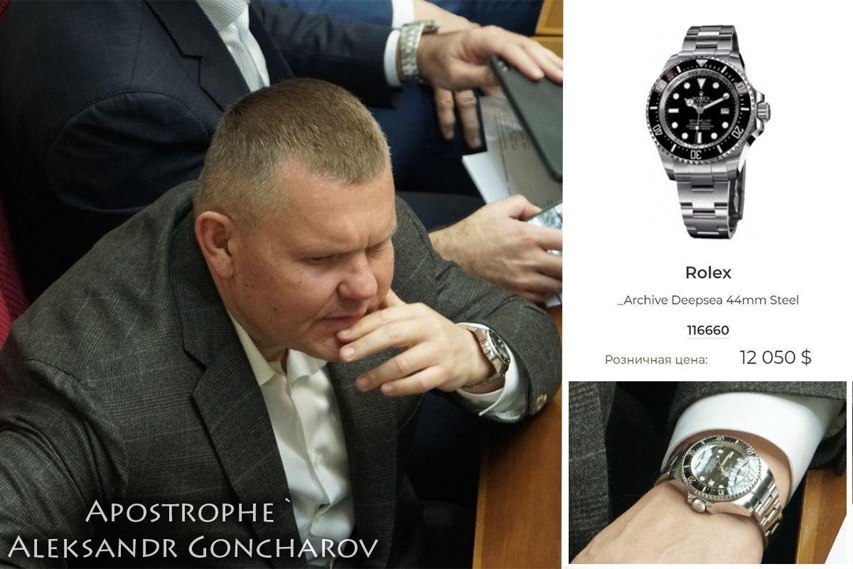 В объектив камеры попала дорогостоящая модель часов Rolex, украшающая руку Валерия Давыденко — черниговского бизнесмена, бывшего нардепа от БПП, занимавшего в 2013-2014 годах должность замминистра аграрной политики и продовольствия в правительстве Януковича.
