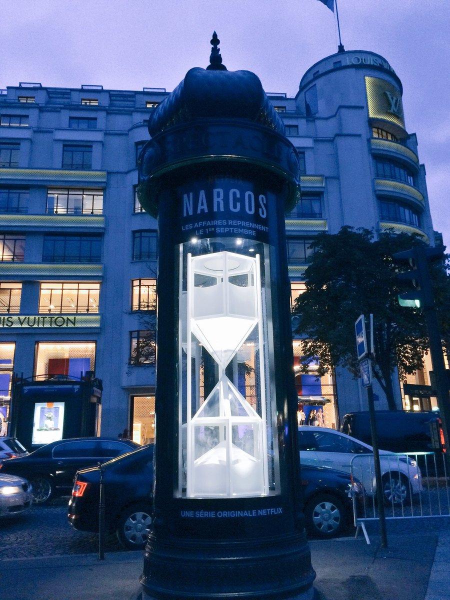 Напередодні третього сезону серіалу «Нарко» у Парижі, Netflix встановив рекламні тумби заповнені пісочним кокаїном.