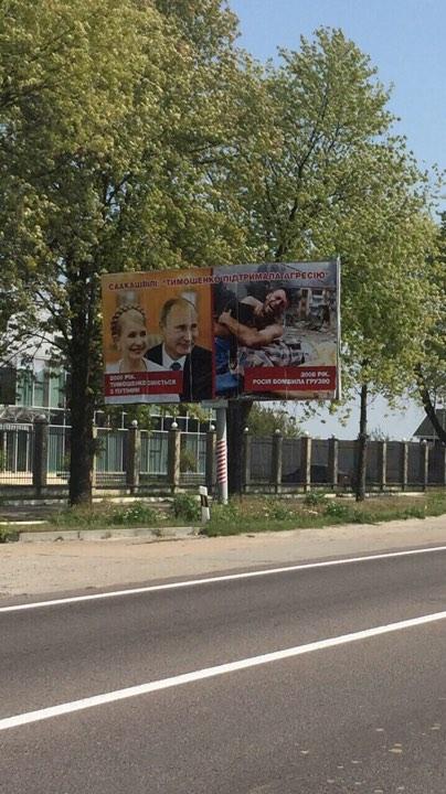 На одному борді наведено слова тодішнього Президента Грузії Михайла Саакашвілі про позицію тодішнього прем'єр-міністра України Юлію Тимошенко. "Тимошенко повела себе дивно. Вона не засудила агресію Росії", - написано на рекламному щиті