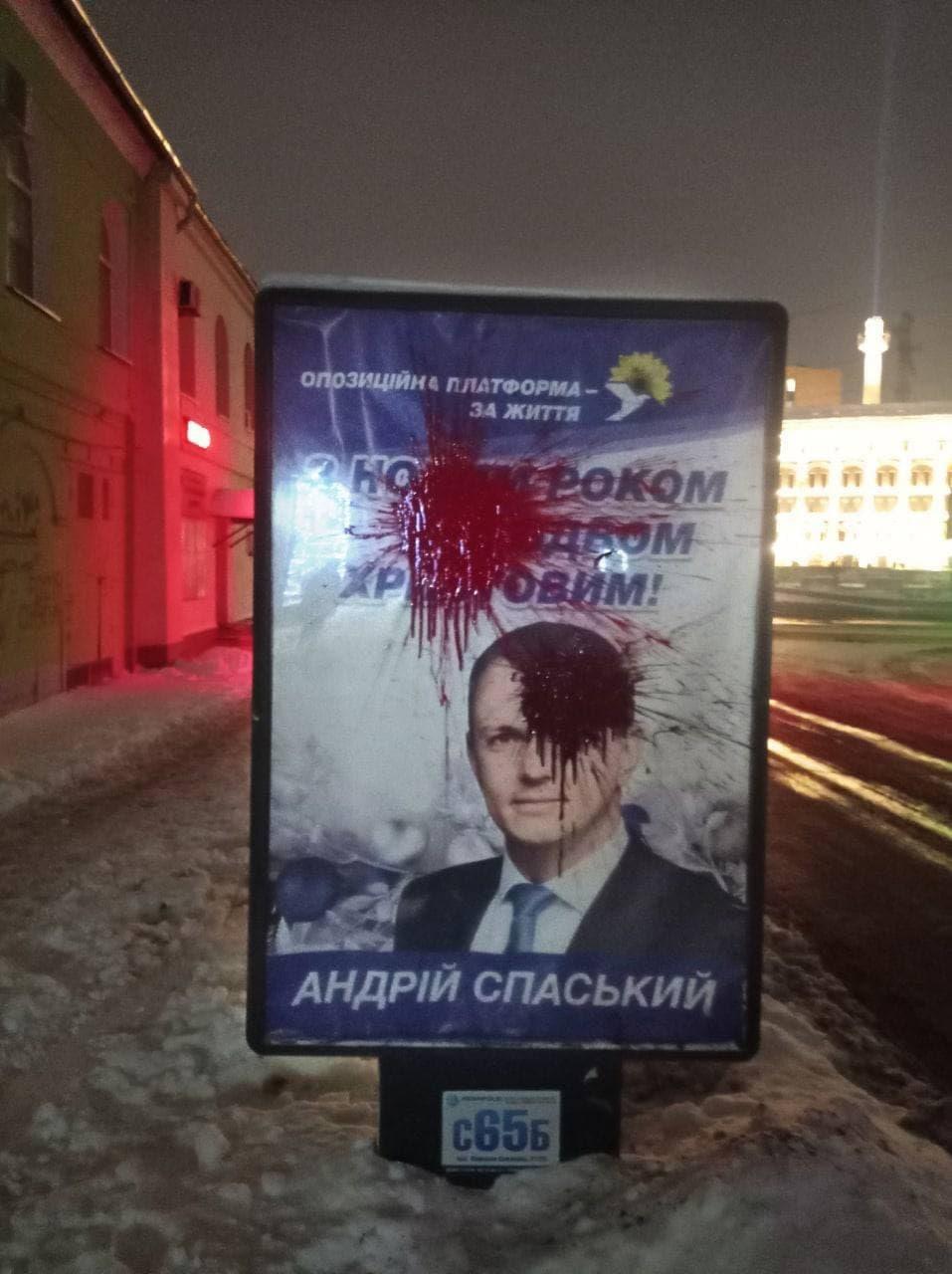 У Харкові невідомі зіпсували новорічні борди депутата міської ради від «Опозиційної платформи — За життя» Андрія Спаського. Їх облили фарбою та обписали образливими написами.