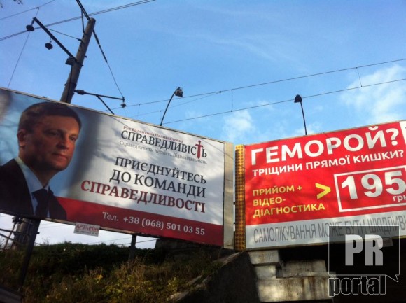 Але часто борди розміщують поярд з іншою рекламою. Так сталося і з рекламою екс-голови СБУ. На Львівщині, його рекламу розмістили поряд з бордом яким був адресований тим у кого геморой