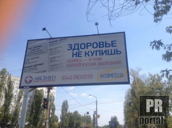 Також у місті можна побачити також борди з рекламою цієї ж клініки на яких написано "Здоровье не купишь".