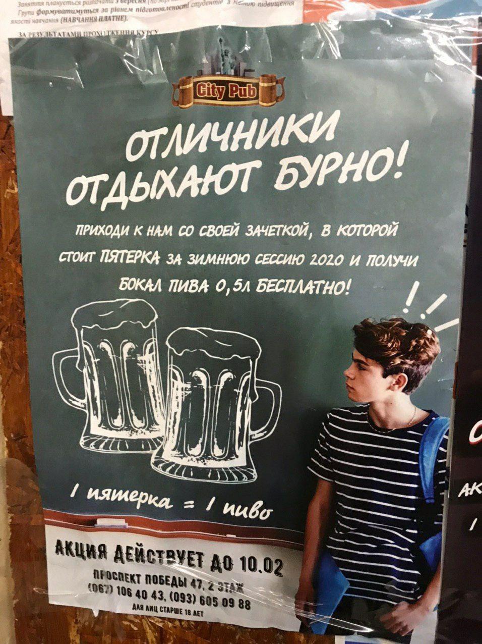 Столичний City pab, котрий розсташований поблизу Національного університету КПІ, студентам-відмінникам обіцяє пиво наливати безкоштовно.
