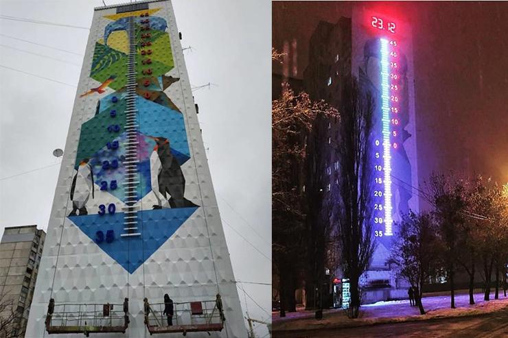 На стіні 16-поверхівки на вулиці Грицевця у Харкові створили мурал із вмонтованим термометром, а також електронним табло, яке показує час.