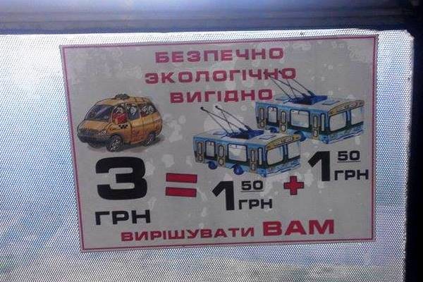 Щоправда, за логікою, такі наліпки мали б бути у маршрутках, адже пасажир, що бачить рекламу у тролейбусі і так вже обрав цей транспорт.