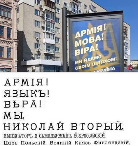 Медіаексперт, котрий працює у штабі Юлії Тимошенко Олексій Мустафін пригадав вислів останнього імператора російської імперії Миколи Другого, котрий збігається зі слоганом президентської кампанії діючого Глави держави:"Армия, Вера, Язык".