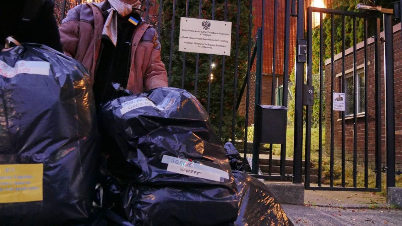Від імені ЗСУ учасники акції доставили під консульство Росії частково мобілізованих.. Біля паркану філії Мордора вивантажили чорні мішки з написом: "ЗСУ: захищаємо Україну, фасуємо до пакетів окупантів 2-ї армії світу".