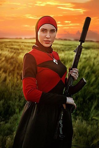 Отметим, что на фото Окуева предстала в платке и платье в красно-черных цветах, которые считаются символами и представлены на флагах политического движения ОУН и националистической организации "Правый сектор". Также свой образ девушка дополнила массивным автоматом. Добавил красок и закат солнца на заднем фоне.