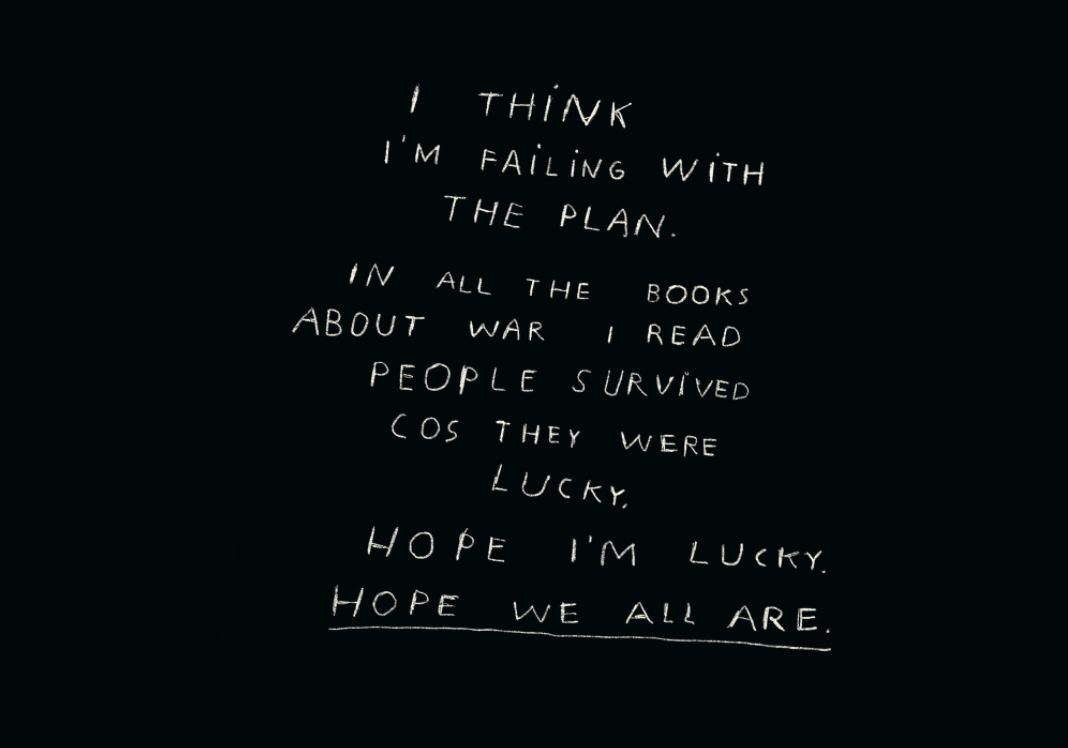 Я думаю, що мій план невдалий. У всіх книгах про війну, які я читала, люди виживали, бо їм щастило. Сподіваюсь, я теж везуча. Сподіваюсь, ми всі везучі