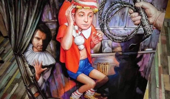 На холсте изображена рука Карабаса-Барабаса, которая держит хлыст. Он обращён в сторону Буратино, который очень похож на украинского шоумена Владимира Зеленской, недавно заявившего о своём желании баллотироваться на пост главы украинского государства. За ним стоит Пьеро. В его образе представлен фронтмен культовой украинской музыкальной группы «Океан Эльзы» Святослав Вакарчук.