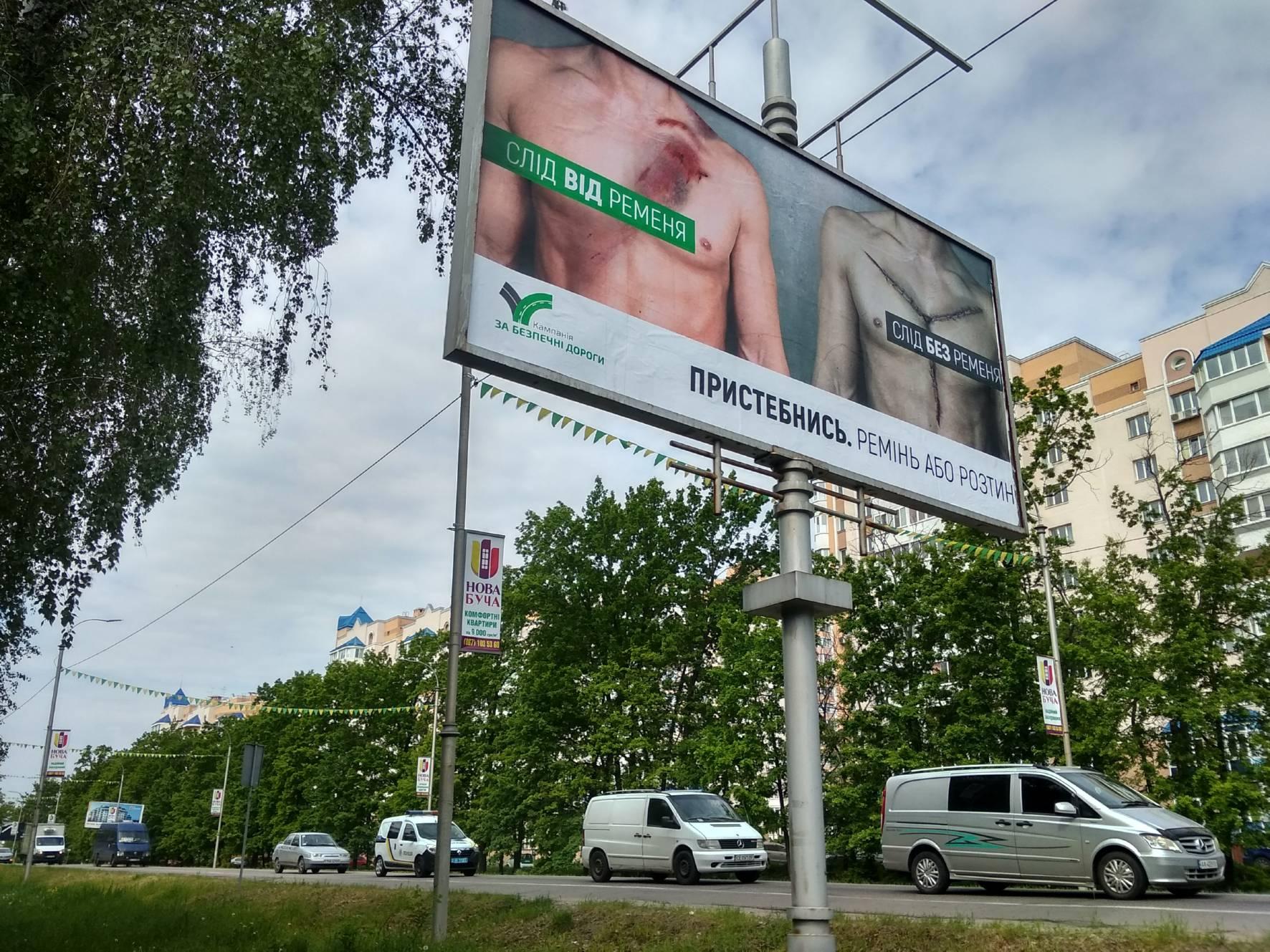 У травні була запущена інформаційна кампанія “Ремінь або розтин”, яка спонукає українців пристібати ремені безпеки в авто. На 180 білбордах по Україні розміщене зображення чоловіка з синцями від ременя безпеки та інше його ж фото зі слідом від розтину. Автори реклами пропонують шокуюче порівняння, демонструючи наслідки автокатастрофи для людини, яка не пристібається паском безпеки, - повідомляє PRпортал.
