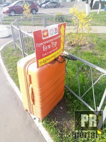 Рекламу з підручних матеріалів зробили у туристичному агенстві "Бум Тур". Взяли валізу, прив'язали її до паркану, поставили табличку з назвою фірми і телефоном і отримали начний рекламний носій.