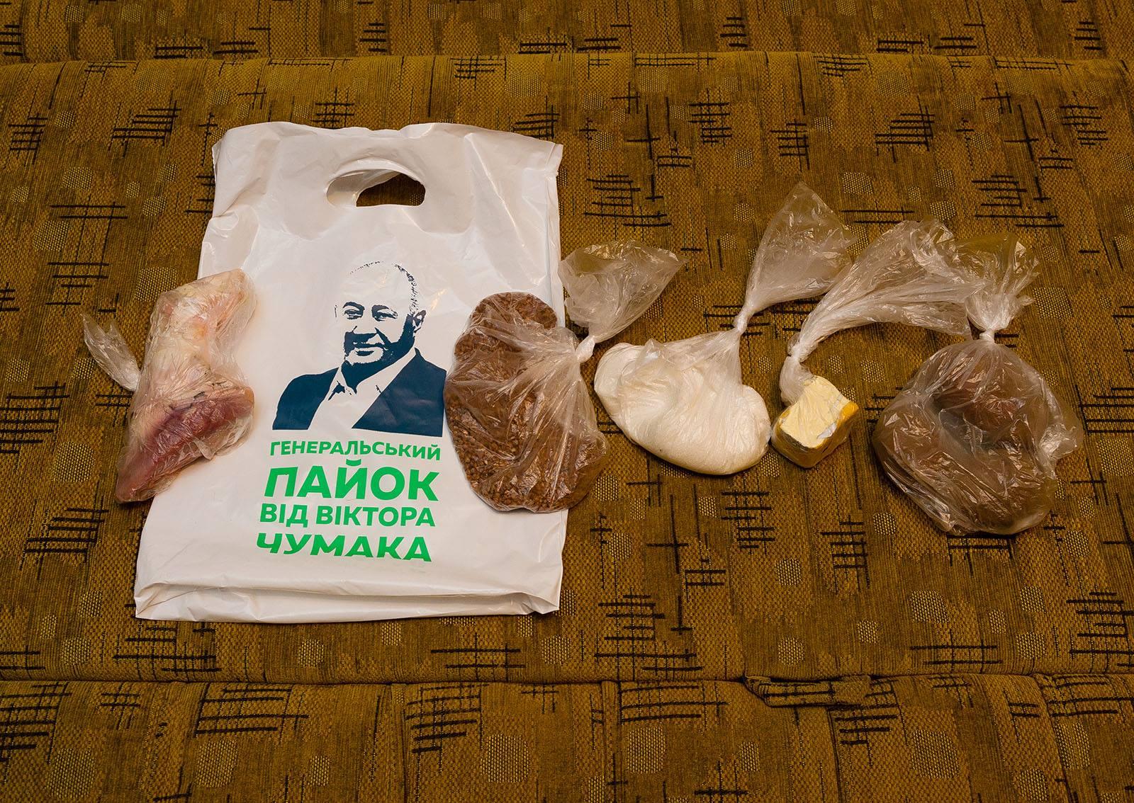 "Щойно. Дзвінок у двері. На порозі двоє хлопців з кульками в руках. "Вот пайок от вашего народного депутата Виктора Чумака!", - написав журналіст і навів вартість набору "генеральського пайка від Віктора Чумака": гречка - 183 гр., сир - 70 гр., картопля (3 шт.) - 311 гр., цукор -182 гр., кістка - 370 гр., кульок - 1шт.