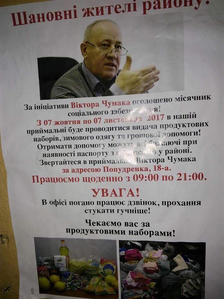 Мешканці столичного мікрорайону Микільська Слобідка отримали продуктові набори ніби-то від народного депутата України Віктора Чумака. Як повідомляє PRпортал, про такий "побутовий чорний піар" на своїй сторінці у Фейсбук повідомив журналіст Олександр Сенько
