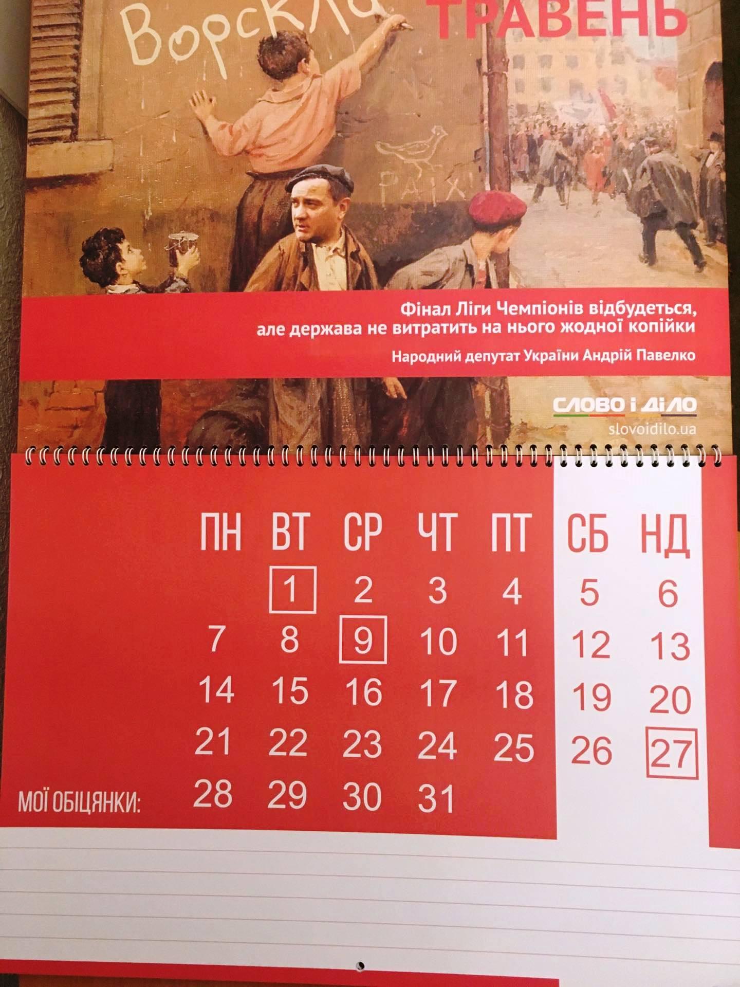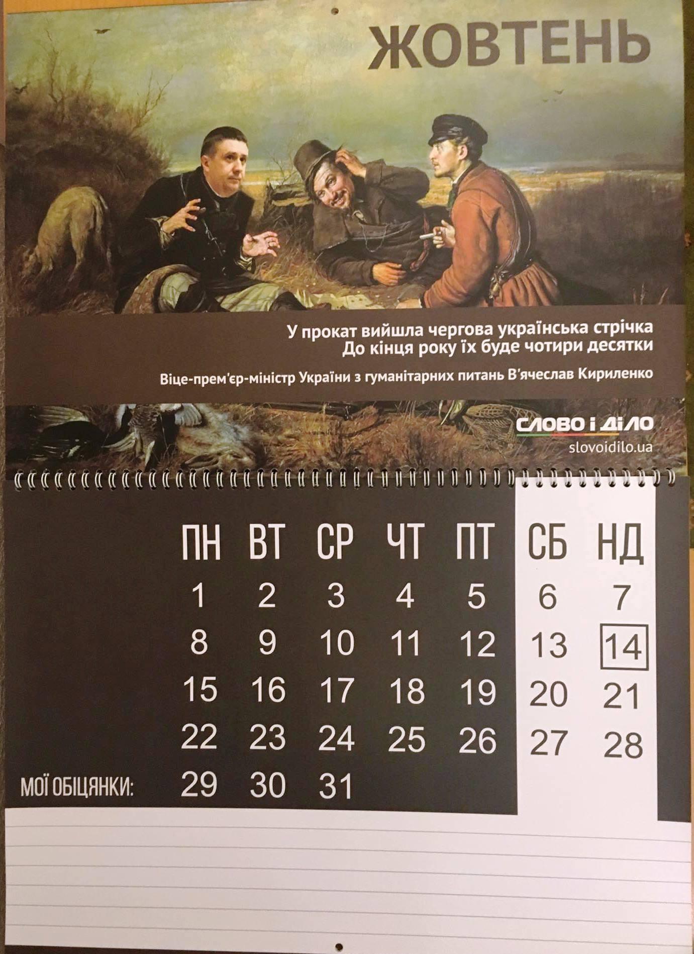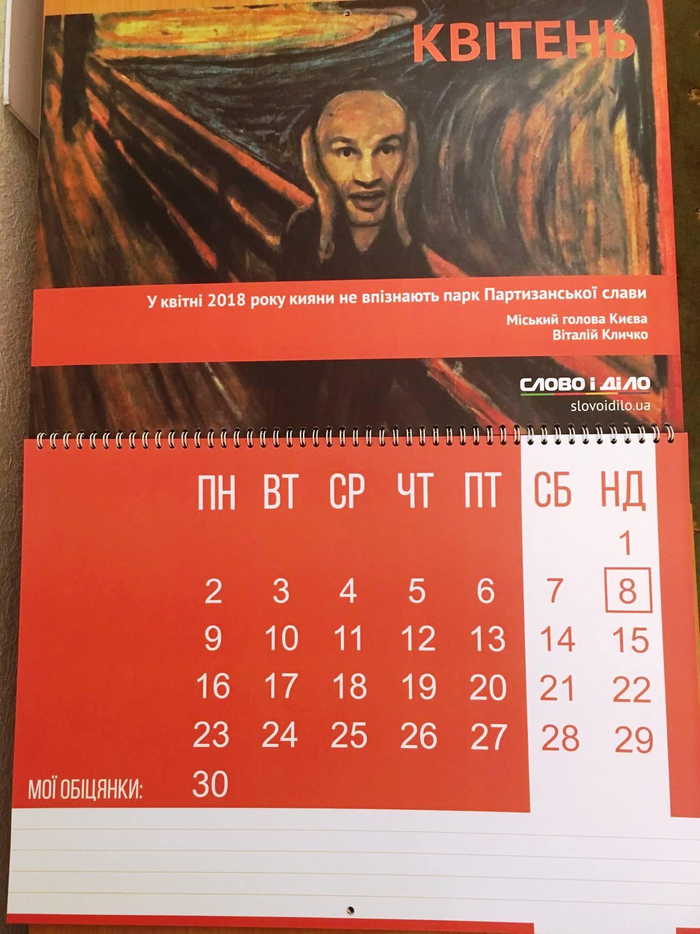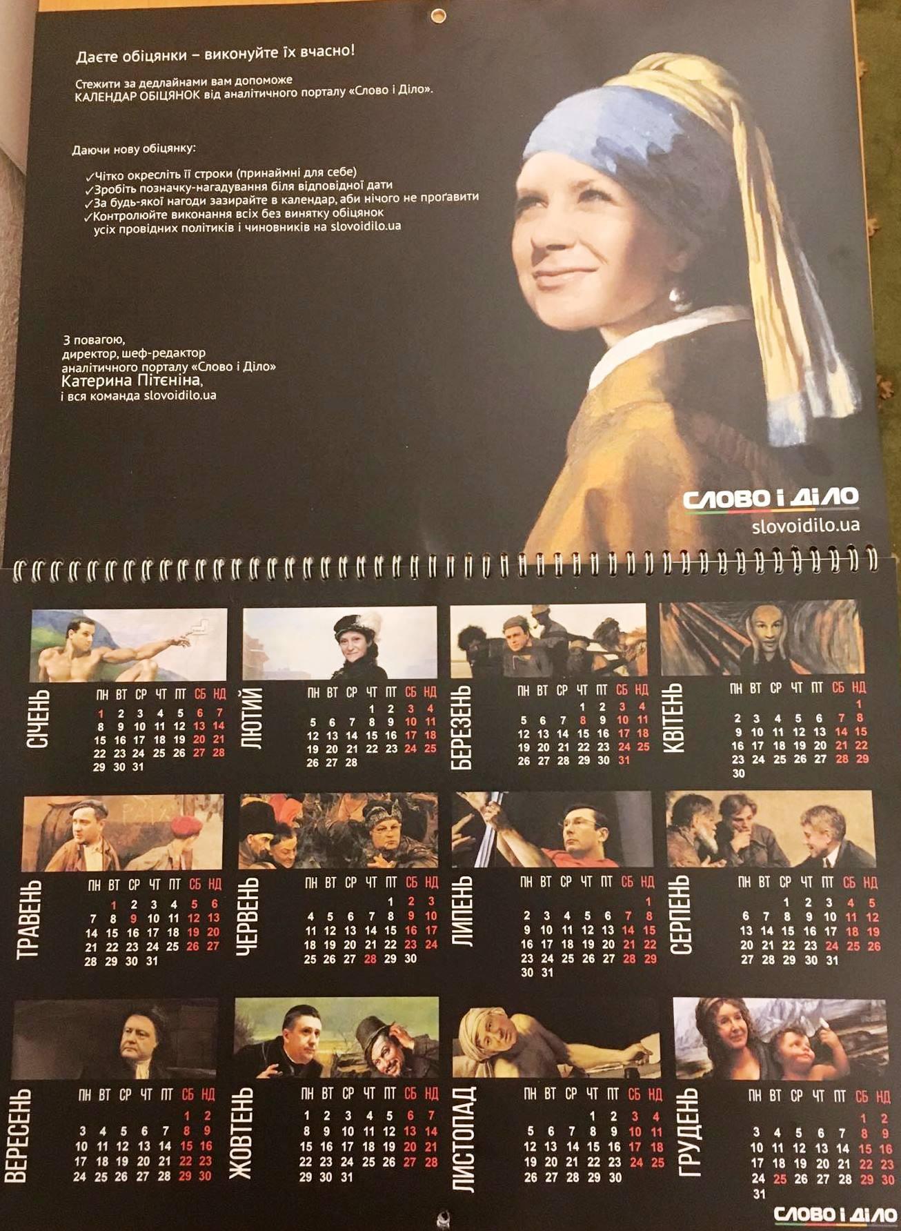 В календарі кожен політик зображений у вигляді відомої картини, наприклад мер Києва Віталій Кличко уособлює «Крик» — норвезького художника Едварда Мунка, а міністр Кабміну Саєнко зображений у вигляді фрески Мікеланджело Буонарроті - «Створення Адама»