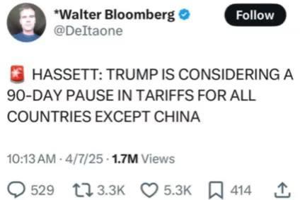 Удень 7 квітня в медіа поширили новину про те, що директор Національної економічної ради США Кевін Гассет нібито сказав, що Трамп розглядає 90-денну паузу в запровадженні мит. Ведучі американського телеканалу CNBC прочитали цей заголовок у прямому ефірі, намагаючись пояснити, чому ринок раптово почав рости.
