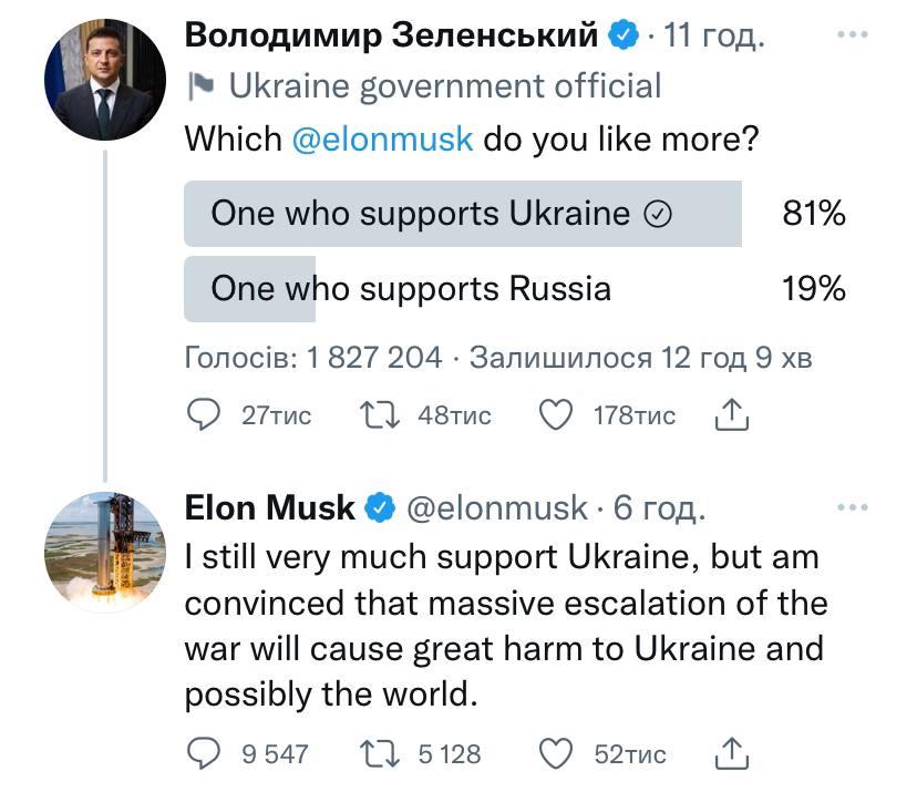 Не залишився осторонь ситуації і Президент України, який ретвітнув Маска та запитав, хто йому довподоби більше: той, хто підтримує Україну чи росію?