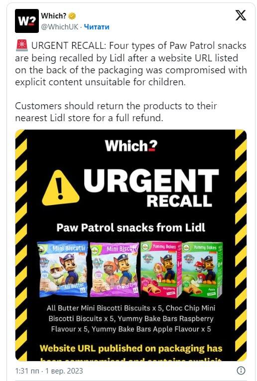 Як повідомляють британські джерела, Lidl масово відкликає всю лінійку дитячих снеків марки «Щенячий Патруль» після раптового «відкриття», що офіційний сайт бренду на упаковці печива веде на сумнівну сторінку з цілою купою порнографічних матеріалів.