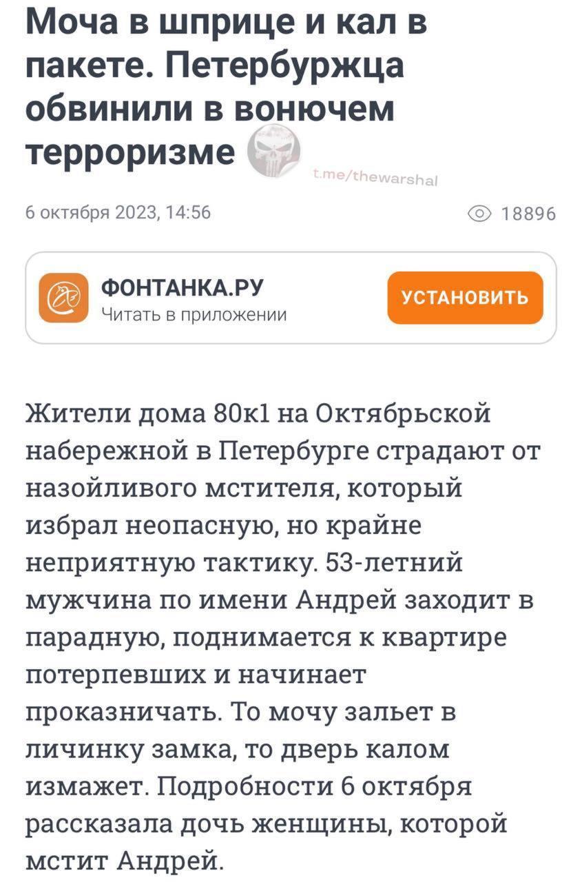 «Вероятнее всего, этот нездоровый человек специально настаивал раствор (а возможно, и добавлял в него что-то еще) прежде, чем залить в дверные механизмы. У мамы появились приступы тошноты и удушья. Несколько раз она не смогла открыть собственную дверь, чтобы выйти на улицу, так как замки подверглись коррозии от вливаемого раствора. Это уже не только причинение материального ущерба, но и умышленное причинение вреда здоровью человека. Это подлый подковерный террор, жертвой которого стали все жители подъезда», — вважає жертва месника з Петербурга.