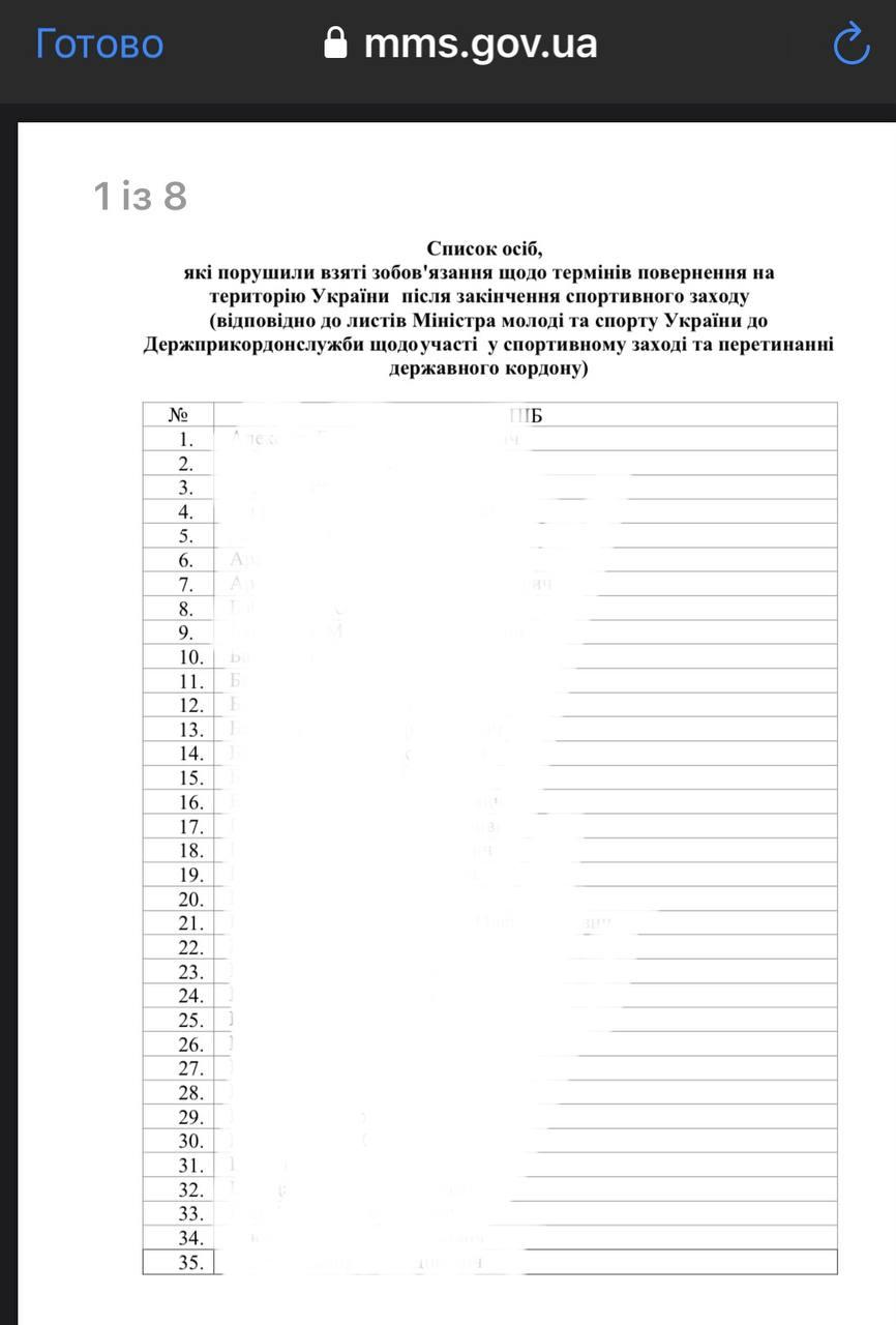 Видалений список на сайті Мінспорту України. Фото: скриншот