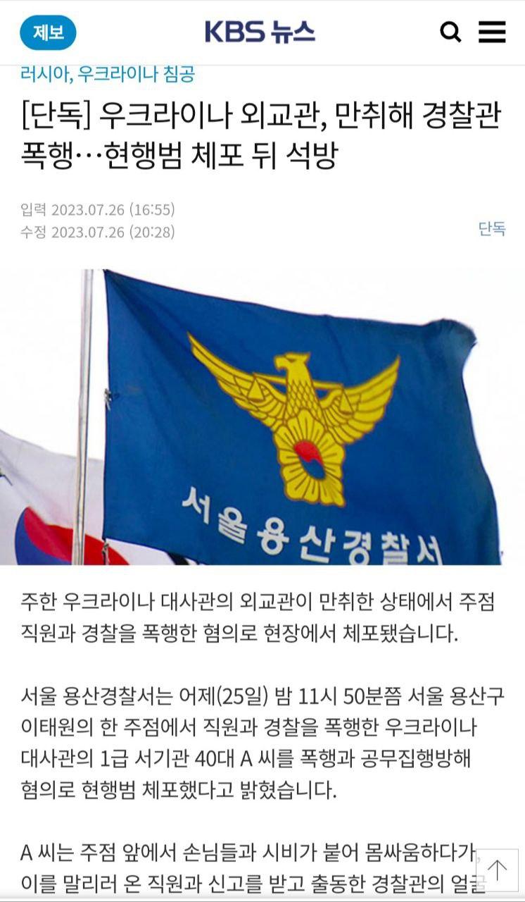 26 липня південнокорейське видання KBS повідомило, що в ніч з вівторка на середу до поліції надійшло повідомлення про бійку в сеульському барі. Виявилось, що 40-річний дипломат з посольства України влаштував бійку з іншими відвідувачами закладу, в ході якої також напав на працівницю бару та поліцейського, які намагалися розборонити відвідувачів.