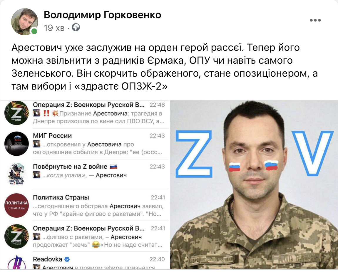 "Арестович уже заслужив на орден герой рассєї", - написав політтехнолог та депутат Київської обласної ради Володимир Горковенко. "Тепер його можна звільнити з радників Єрмака, ОПУ чи навіть самого Зеленського. Він скорчить ображеного, стане опозиціонером, а там вибори і «здрастє ОПЗЖ-2», - написав Володимир Горковенко