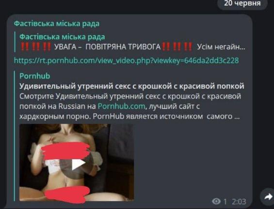 У ніч на 20 червня у телеграм-каналі Фастівської міської ради, який має понад 20 тисяч підписників, невідомі розмістили посилання на сайт «Порнхаб» з відповідним відео. Через пів години порнографічне відео видалили.