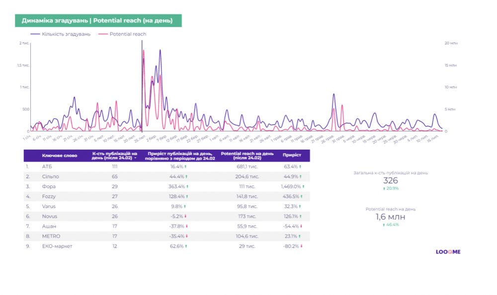 - Найбільший приріст показав магазин Фора (+363% до кількості згадок та +1,469% охоплення, порівняно з періодом до 24 лютого).