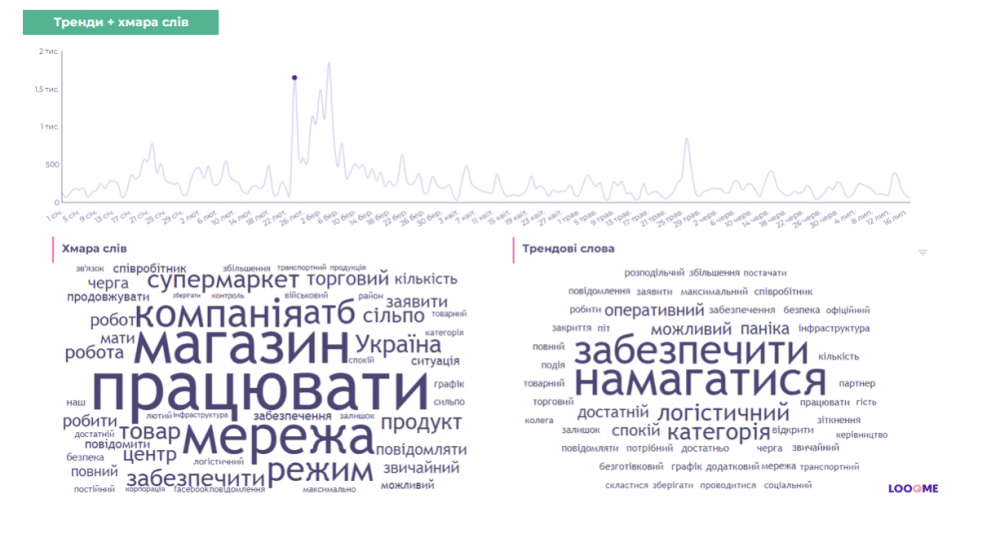 Інший пік був 24 лютого — 1649 публікацій. Тоді контекст текстів склали слова, пов’язані з режимом роботи магазинів: “магазин”, “працювати”, “мережа”, “режим”, “компанія”. А в трендах були слова “намагатися”, “забезпечити”, “логістичний”, “категорія”.