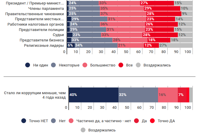 Непосредственное отношение к коррупции имеют более 60% госслужащих, парламентариев, работников налоговой сферы, судей, сообщили респонденты. Коррумпированность президента и премьер-министра признали 60% опрошенных. Давали взятки при взаимодействии с органами власти в течение последнего года 38% наших сограждан. Чаще всего украинцы платили при получении услуг в начальных и средних учебных заведениях (38%), медицинских учреждениях (33%), при взаимодействии с дорожной полицией (33%), в системе профессионального образования (31%), оформляя выплаты по безработице (9%) и социальные льготы (6%).