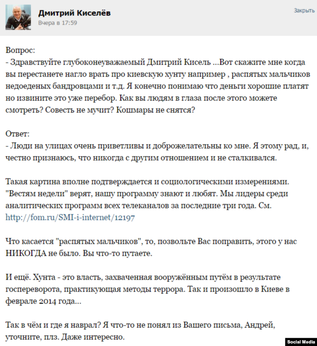 Автор і ведучий програми «Вести недели» на каналі «Россия-1», а також найпомітніший проросійський агітатор Дмитро Кисельов пробує себе в соціальних мережах. За його словами, аби протистояти шквалу несправжніх, тобто фейкових сторінок, він зареєструвався в мережах Instagram та Facebook. Утім майже одразу сторінки зникли – адміністрація їх видалила через численні скарги. Згодом їх відновили, але тепер Кисельов набирає аудиторію в російській мережі Вконтакте. Експерти припускають, що журналіст виявився неготовим до шквалу критики, образ та грубощів, які прочитав у коментарях.