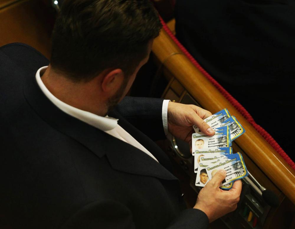 Нардеп Антон Яценко тримає картки колег по депутатській групі “Відродження” у ВРУ 8-го скликання. Фото: Рух ЧЕСНО