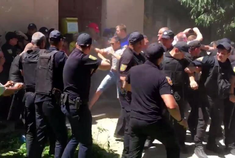 В субботу, 2 июня, в Цебриково стало еще горячее. В 13:01 в полицию поступило анонимное сообщение о заминировании почтового отделения, в помещении которого расположен избирательный участок. "Для обеспечения безопасности людей полицейские начали их эвакуацию. Действия правоохранителей возмутили некоторых граждан. В результате собравшиеся начали сопротивляться и распылили в сторону сотрудников полиции газ. По предварительным данным, в результате физического противостояния пострадало 13 правоохранителей", - говорится в сообщении полиции.