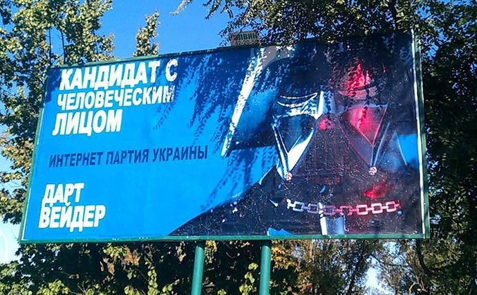 Як політик Дарт Вейдер показав себе у 2014 році. Тоді одразу кілька "темних лордів" намагалися потрапити через округи Києва та Одеси. Кандидат у депутати намагався залучити аудиторію епатажем. У своєму передвиборчому ролику герой зоряних війн грав на бандурі "Імперський марш", а лозунгом кампанії став вислів: "Не дамо з'їсти нашого сала".